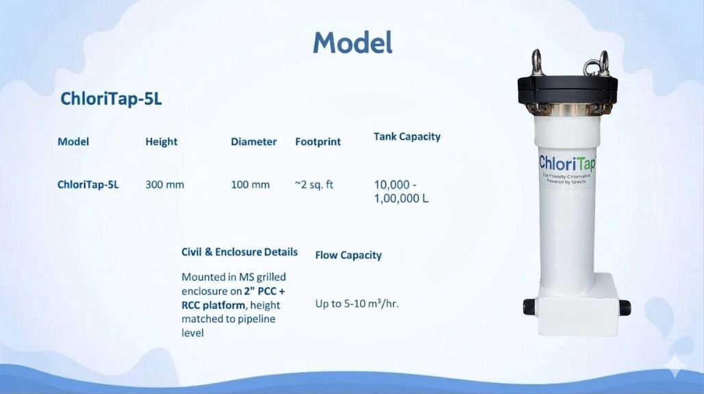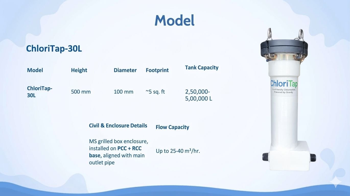 | ChloriTap™-30L | 30 Lakh | Gram Panchayat tanks, ESRs | Centralised chlorination for communities |