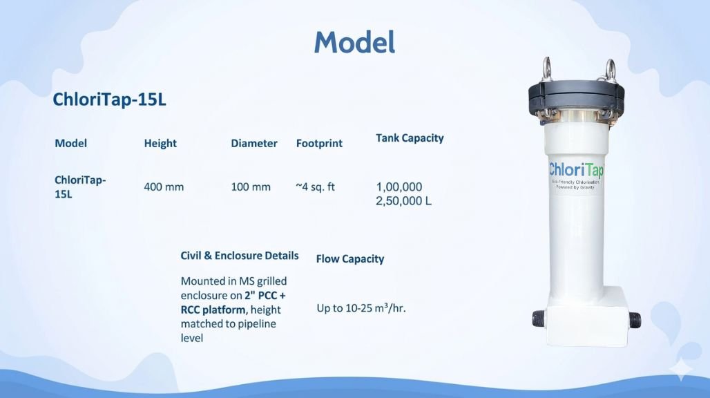| ChloriTap™-15L | 15 Lakh | Small village pipeline schemes | Inline disinfection for rural water lines |